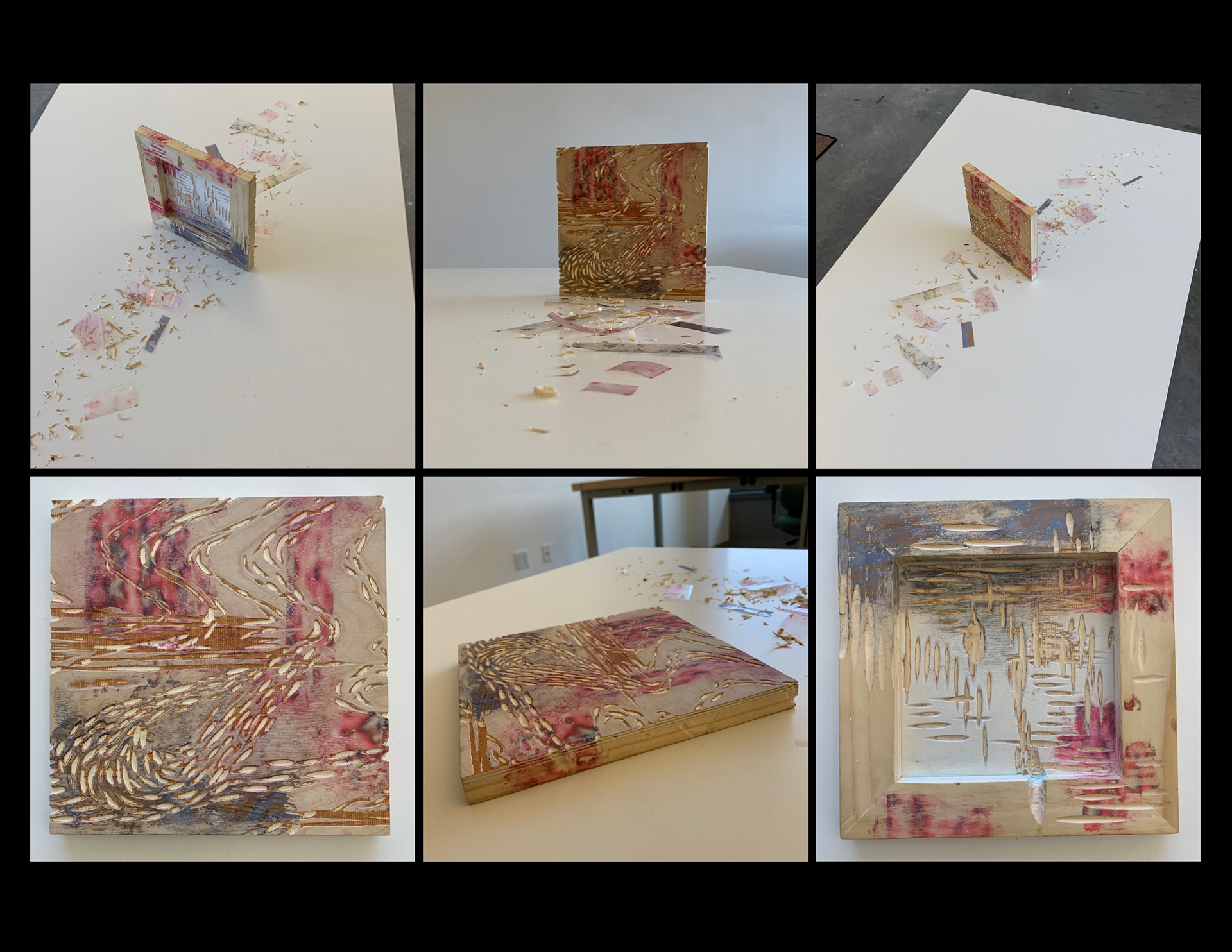 1’x1’x2” : Wood, wood carvings, transparent film, alcohol, and ink from print transfers
